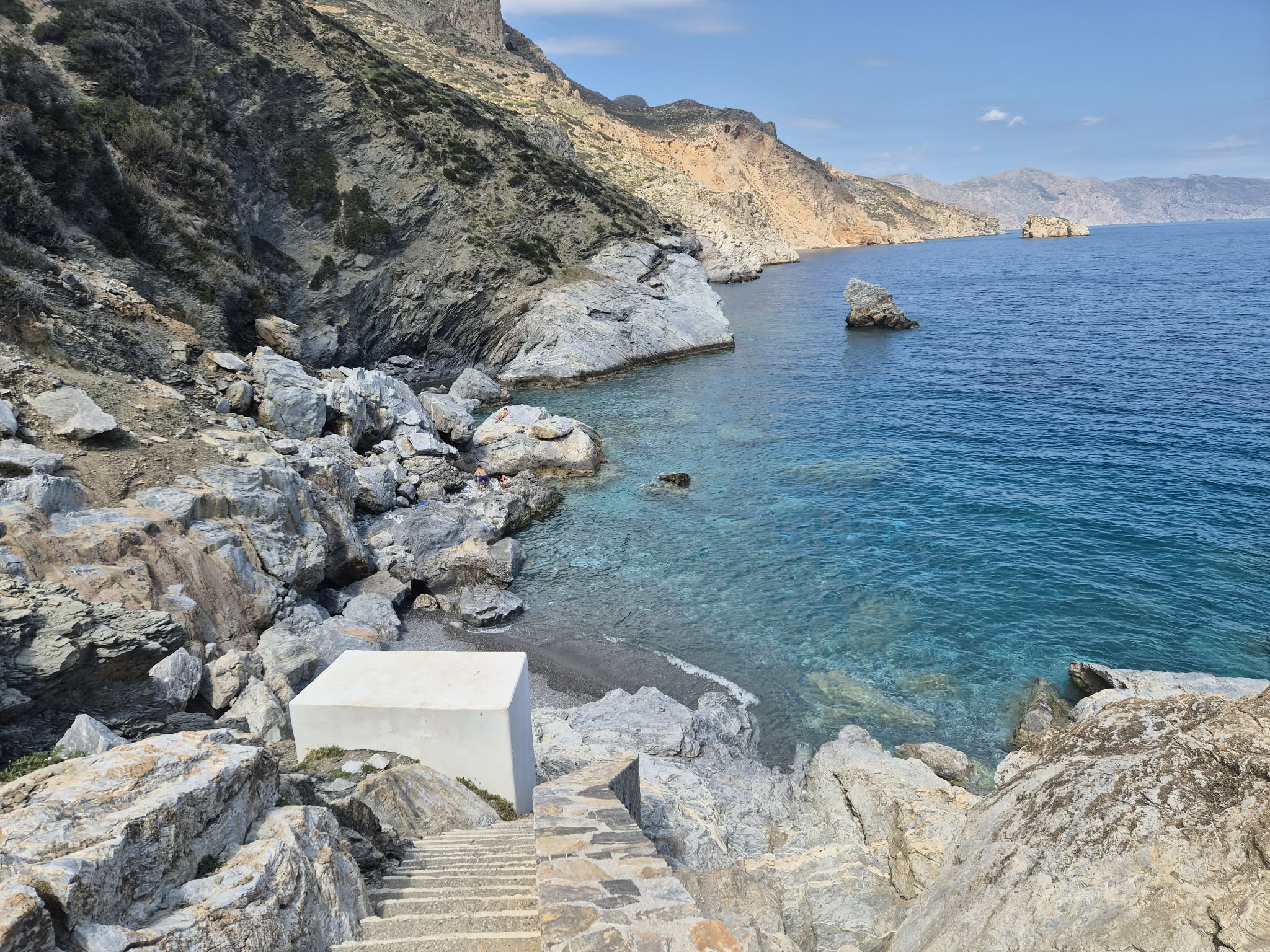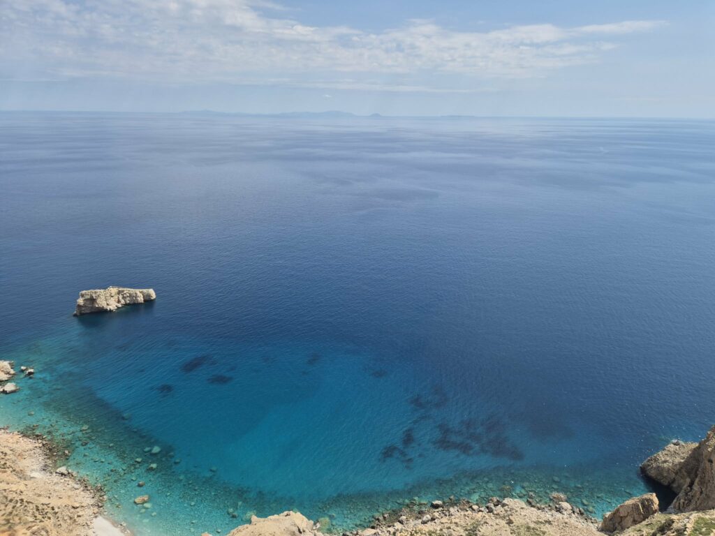Όσο αδιαπραγμάτευτη όμως και να είναι, όταν το πρωτοβλέπεις, η αλήθεια είναι ότι μαγεύεσαι. Επιβλητικοί και απόκοσμοι βράχοι, ψηλοί και όπου κι αν κοιτάξεις απέραντο γαλάζιο. Κανένα εμπόδιο, καμία στενάδα. Θάλασσα και ουρανός γίνονται ένα.