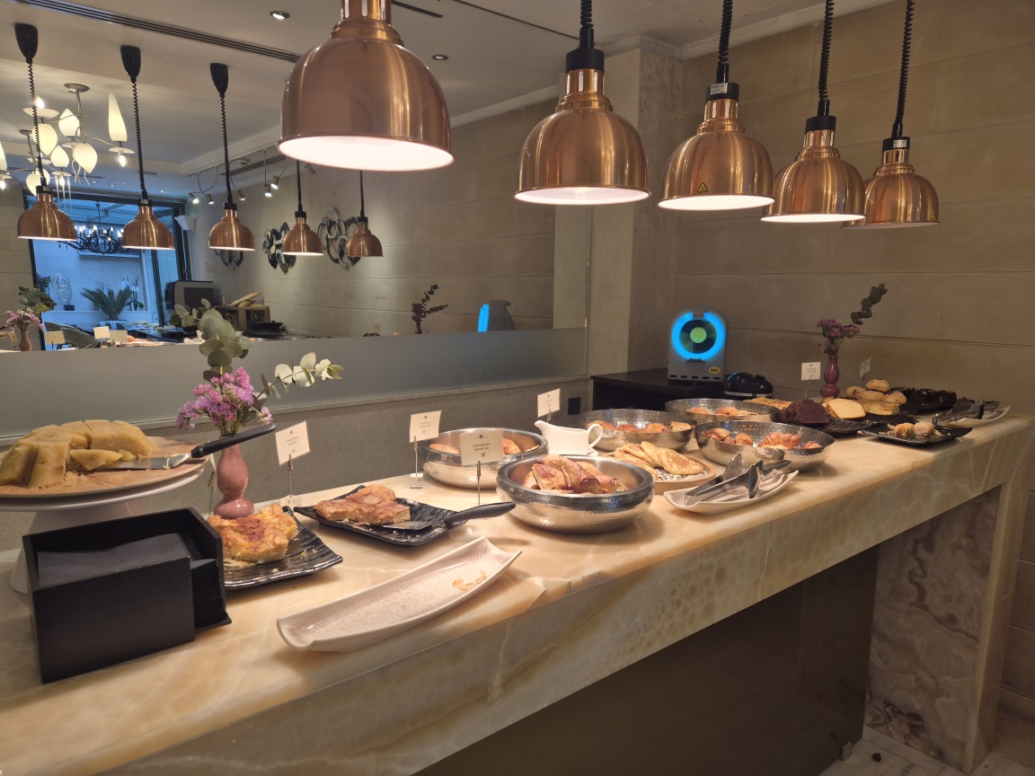 Παράλληλα η ανανεωμένη φωτεινή σάλα δίπλα στον καταρράκτη προσφέρει πλούσιο πρωϊνό μπουφέ, με πληθώρα ελληνικών προϊόντων και γεύσεων, ενώ το πρωινό σας συνοδεύεται και από live μουσική πιάνου.